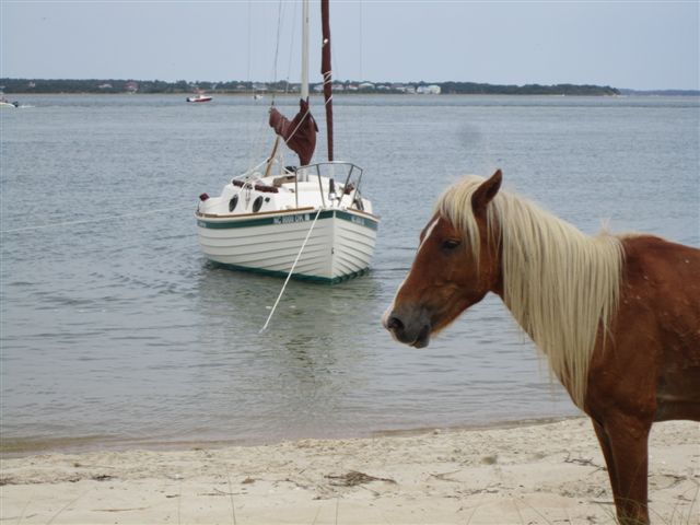 Yesterday was a perfect example of why Sept-Nov is THE sailing season here on the coast of North Carolina. The day started at 8 am pulling off the dock lines and by 8:05 we're in the ICW (Intracoastal Waterway). Not a breath of wind so we motored the 8.2nm and dropped anchor on Shackleford Island. The path took me through the Morehead City Turning Basin, the second largest port in NC across the Beaufort Inlet to Shackleford. Crossing the inlet was totally non eventful as there was still no wind and I hit it at just about the slack of low tide. A beach picnic was scheduled for the day. Another 5 boats (all power boats) were due to arive at 11. The reason I left at 8 was because I expected the trip to take something just short of that. But I got lucky and hit the last of the outgoing tide to the inlet which covered the first 6.5nm. Both the sound and the inlet were like a milk pond. At 9:30 we pulled straight into the beach. We averaged 5.4 kts! I had to check my GPS to make sure I had the distance correct. Yep, 8.2 thanks to a nice tidal current and a 6hp Tohatsu. I dropped the Guardian FX7 off the stern and let it pay out all the way to the beach and cleated it off. My mate took the Manson Supreme 15# to the bow and swung it off the front as far as possible. I hopped out and moved the bow anchor up onto the beach shoved it into the sand at the high water mark on the beach. Then I pulled in the slack from the stern anchor and recleated. With time to kill we had some more coffee as I listened to my mate, David, somewhere in his 70's. He grew up 'down eas', has owned several boats (mostly at the same time) and bleeds salt water. While he poured coffee and some kind compliments my way on the anchoring he offered some observations to make life simpler. He smiled and said I may have thrown out the stern anchor a little too early. This was evidenced by the nearly 160' of line I laid out. We were in water never deeper than 5'!! Then I started rethinking my anchoring strategy. I watch him easily hold onto the Manson and walk it up to the bow. The Manson has a big roll bar that makes it easy to carry. Before he went forward he picked up the anchor and layed the 12' of chain overboard from the cockpit and left the WalMart hand basket in the cockpit sole. Then he just walked up the bow and chucked it in and cleated it off on the bow cleat. He made it look so simple. And this was a lot simpler than my "drop from the stern; cleat at the stern; walk the line bag forward; cleat at the bow; walk back with the bag; and finally, uncleat the stern." David say's he's in his 70's but then slips up and talks about being a pilot in the Korean War!!! So... lessons learned and things I'll change. 1. Find a pair of knock off WalMart hand baskets and bring the one I have back to WalMart. Not like they really miss it or need the money, but I think it's bad mojo to keep it. 2. Save the mesh bag for backup line in case the anchor line isn't long enough. Putting the line back into the hand basket took no time compared to repacking the bag. Do I hear a bunch of 'I told you so, Joe'? 3. Take David sailing again real soon. We left around 3:00. The wind picked up to a respectable 8-10. We had a beam reach all the way back with a couple of close reaches. Seas picked up and there were a gazillion boats out. The tide was just starting against us but we still made it back in two hours. A respectable 4kts average Tip of the day. If your boat is covered with dew it will dry faster if you hose down your boat?? I learned that one from David too. Picture of the day. See attached. These are the famous Shackleford horses. They've been on this island for hundreds of years. That's hundreds, folks. Think about all the hurricanes. There are Vets that go out and give them shots and checkups and there's an organization that culls the herds. Interesting enough, they don't all hang around together like mustang herds. They have their own little mini herds. How cool is that? I wonder if they have their own little 'hoods'?? Enjoy. Redskins kick off in a few minutes. Later. Joe SeaFrog M17