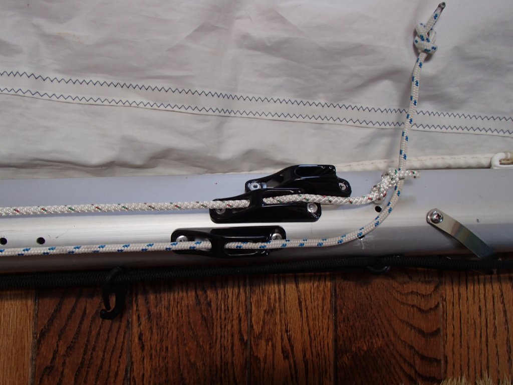 John, you mentioned cheek blocks and clamcleats on starboard side of your boom for clew reefing; are there some form of eye straps used as anchor points on the port side?