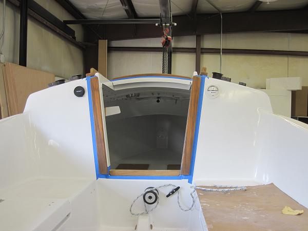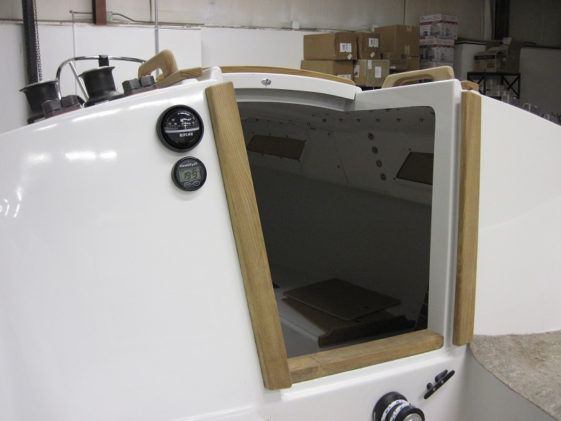 On 9/10/2015 7:45 PM, David Grah via montgomery_boats wrote: David, I built a new lower hatch board and added a teak binocular holder. It contained my 7 X 50 binoculars; my GPS; my VHF radio, and in the right hand corner I had a small Grundig radio with antenna that was in the slot of the hatch board, and therefore protected . However I also wanted a compass. I ruled out the normal - cut a hole in the end of the cabin and mount it there. But, then you have a bulge where you want to lean.... That makes relaxed sitting uncomfortable. My solution was to mount a small Ritchie compass on a teak block, with the forward bottom edge of the block rounded off to fit the molding. In that position , the compass was visible to the helmsman P/S, out of the way; easily stowable when not needed. The block assured alignment, or if my foot touched it and moved it it was immediately evident and could be put back in its proper place with my shoe. It worked nicely for me (I also had a good hand held compass available from our big boat) for taking bearings. Connie
