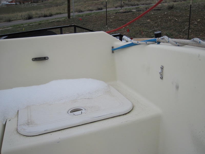 Charlie: picture attached showing the strapeye (transom) and v-cleat (cockpit combing backrest) hardware that WaveFront recommends for the TillerClutch. from the aft cockpit corner it is 12" to the v-cleat and 12" to the strapeye. there are two options for the v-cleat: plastic or metal. plastic bonus is if the pressure gets so great it will break before tearing out the of the fiberglass, but will not hold as firm as metal. contact Katherine and Pete, info@wavefront.com<https://us-mg5.mail.yahoo.com/compose?to=info@wavefront.com>, to purchase the hardware. there are a few negatives to this install: as noted above the hardware can rip out of the fiberglass (installing a backing plate is very very hard as your hands will not fit between the cockpit wall and the transom, and to reach the location of the v-cleat you must cut out the cockpit locker pan); next using the aft cleats the control lines will better hold the tiller (and can't be ripped out); third is drilling more holes in your boat. the TillerClutch on my M17 and S17 use the aft cleats for the three reasons above. note: be sure to loosen at least one side of the control line, and the tillerclutch is unengaged, before moving the rudder up/down. the tillerclutch will stop the tiller from moving up/down (see above comment about ripping hardware out of fiberglass). -- :: Dave Scobie :: former M15 owner - www.freewebs.com/m15-named-scred :: M17 #375 SWEET PEA - www.m17-375.webs.com