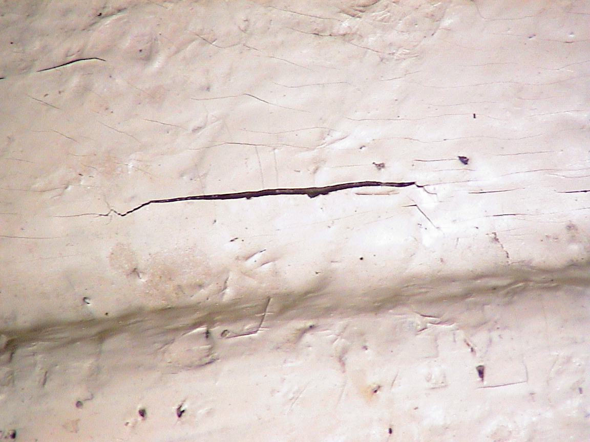 We are going to Lake Pleasant, AZ for a week or so, hoping for a little wind and mild temperatures. I was just in the shop doing a "pre-sail" inspection, and noticed that the front outboard roller of the trailer on the port side was distorting the hull. I went into the cabin and about 8" forward of the battery I found a crack about 1.5" long. (see picture). When I relieved the pressure on that roller, the crack closed up so it was barely noticeable. The crack is not visible from the outside at all. I was thinking about putting a couple of layers of fiberglass over the cracked area, then reinforcing the area by glassing over a one or two inch diameter tube (cardboard or pvc) to provide a reinforcement to the general area. Of course I will adjust the trailer rollers to prevent this from recurring. I have very little experience with fiberglass work, but this seems like a reasonable fix. Has anyone on the list had this sort of problem, and can anyone suggest a better fix? Thanks in advance for your help. Tom Woodworth M-17 "Wild Hare"
