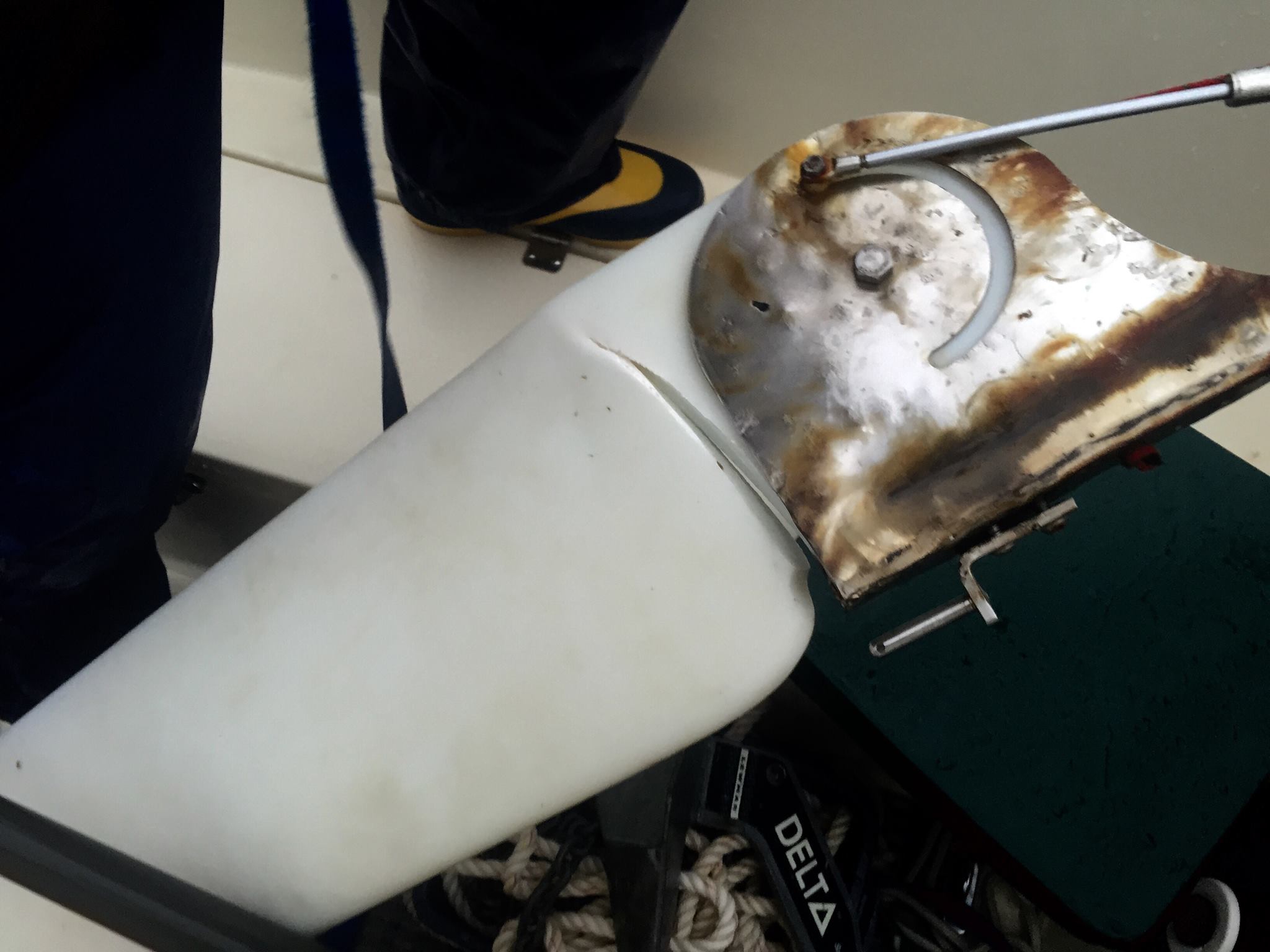 I hope Team Excellent Adventure doesn't mind me reposting this image (attached). The Ruddercraft kick-up rudder on their M17 failed twice during the Race to Alaska, once breaking a weld, and the second time actually snapping the rudder blade itself. They were in much rougher conditions (8 foot seas) than most M17s ever experience. I don't mean to attack Ruddercraft, but just wanted to mention/discuss this as I suspect the factory solid mahogany rudder is stronger. Joel Santarone of Ruddercraft has been straightforward in the past about collecting and sharing failure statistics, and shows here that they have had failures, but their failure rates on most boats are lower than with the factory rudders: http://forum.trailersailor.com/post.php?id=1248931 The factory rudders can also fail, my M15 had a cracked pintle strap when I bought it, but I don't know under what conditions the damage occurred. Sincerely, Tyler Davis, CA '81 M15 "Defiant"