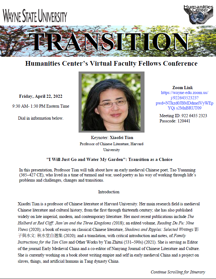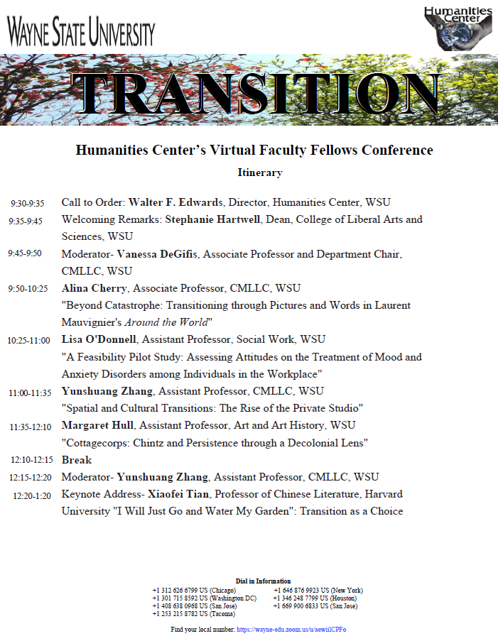 Wayne State Humanities Center Faculty Fellows Conference on "TRANSITION". Friday, April 22 from 9:30 AM to 1:30 PM over Zoom