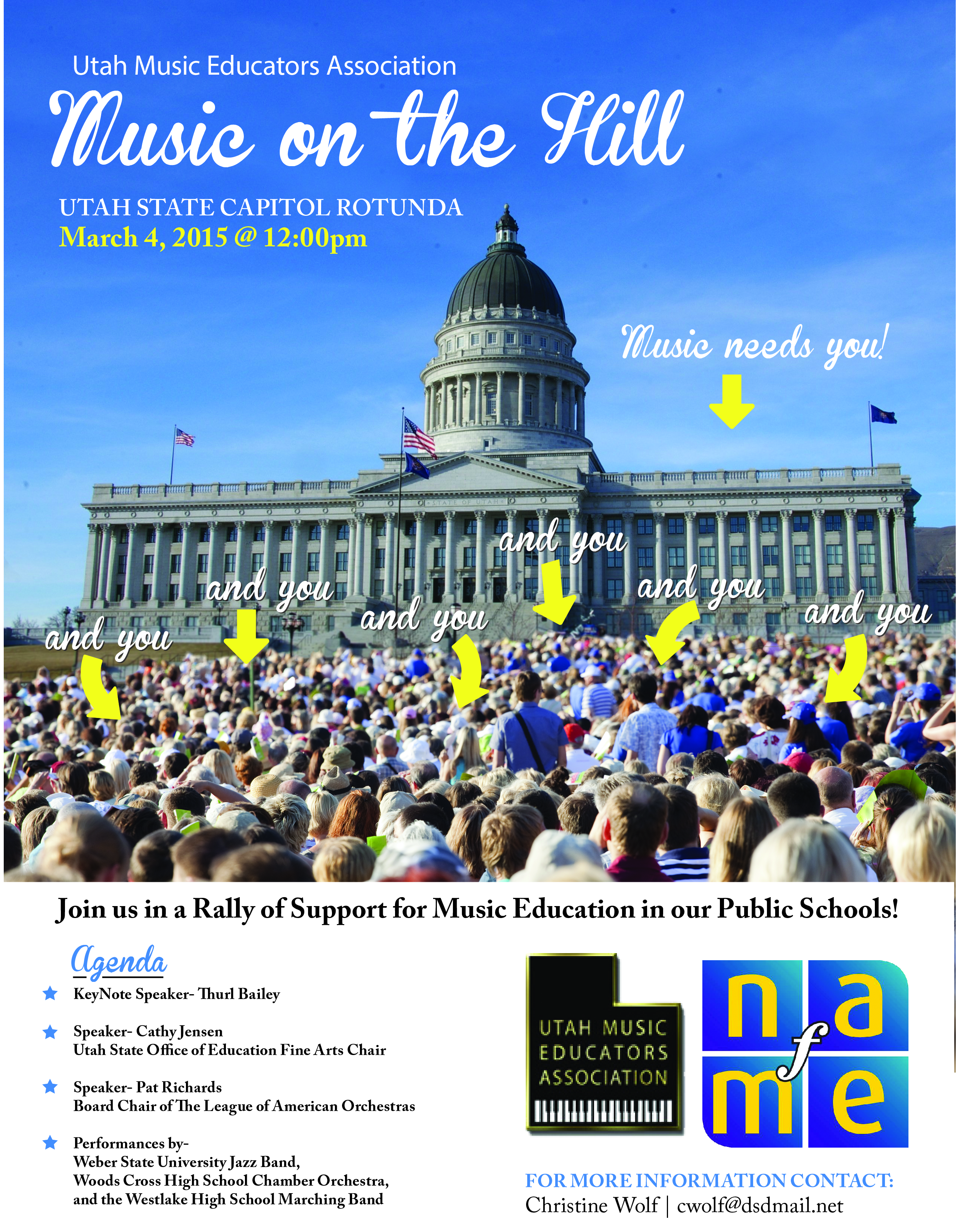 There was a glitch in the email and you may have gotten an email that gave the wrong date for Music on the Hill Day! This is to make sure you know that Music on the Hill Day is in fact at noon March 4, 2015! Flyer is attached. Hope to see you and/or your supporter there. -- sharee jorgensen Canyons District Arts Specialist UMEA Executive Director
