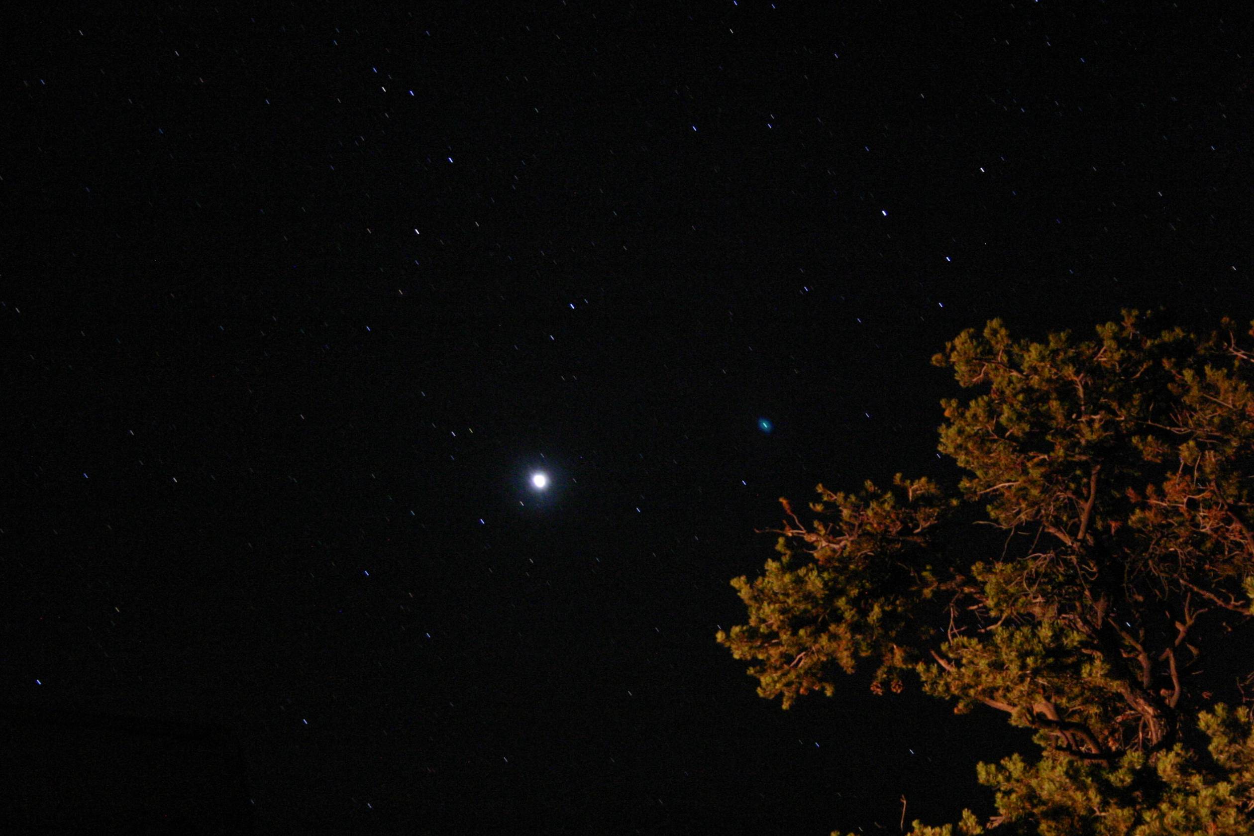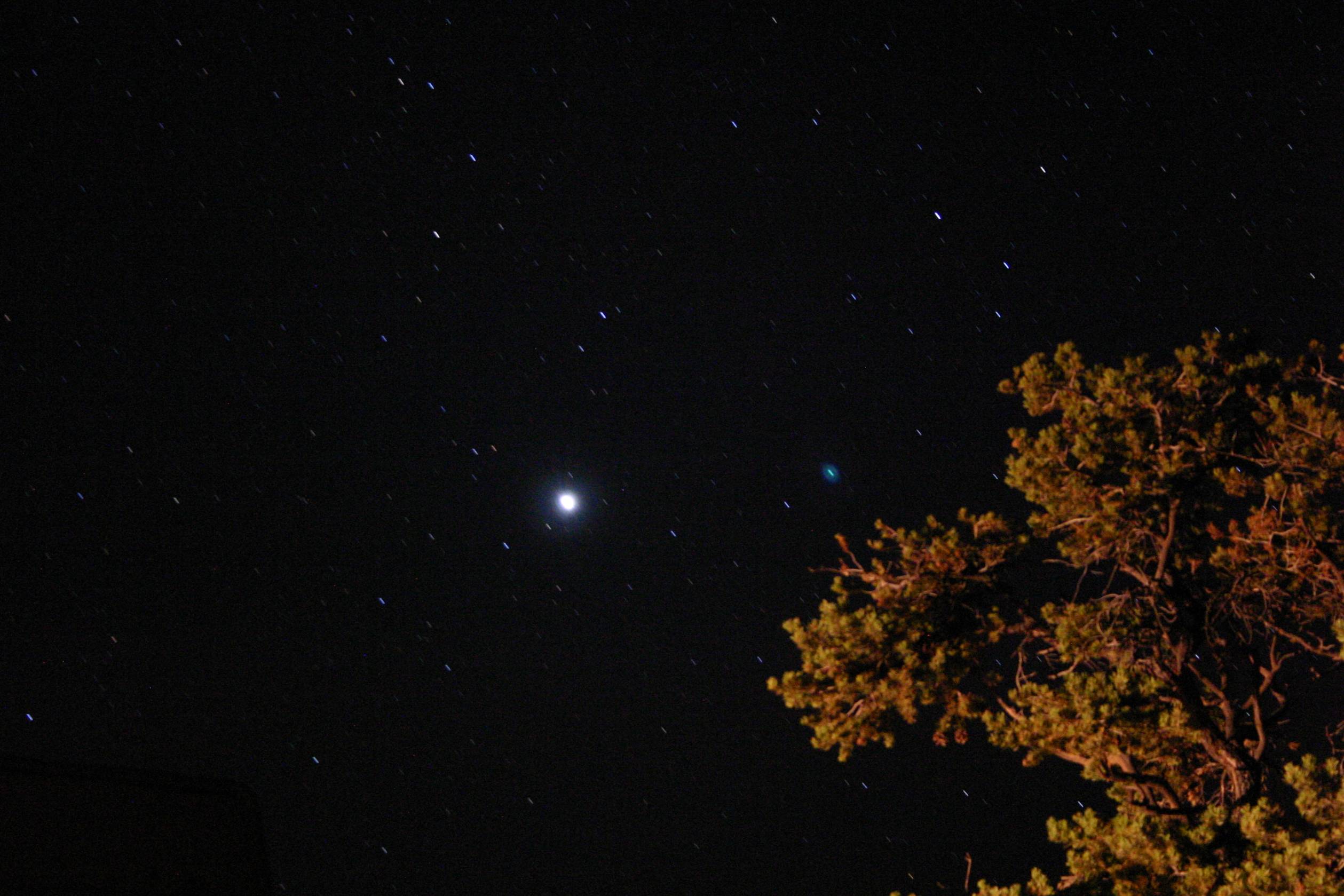 Someone here at my work came to me with two strange photos he took while camping near arches national park last Saturday around 9p. He set up his camera to do a 30 sec exposure of Venus and took another picture a few minutes afterwards. What happens is that you see a normal star trail but when comparing the two photos all the stars except one travel clockwise (to the west of course) and the one brightish blue star (???) travels the exact opposite direction. It is best seen if you have a slide show type viewer that can flash quickly between the two photos.