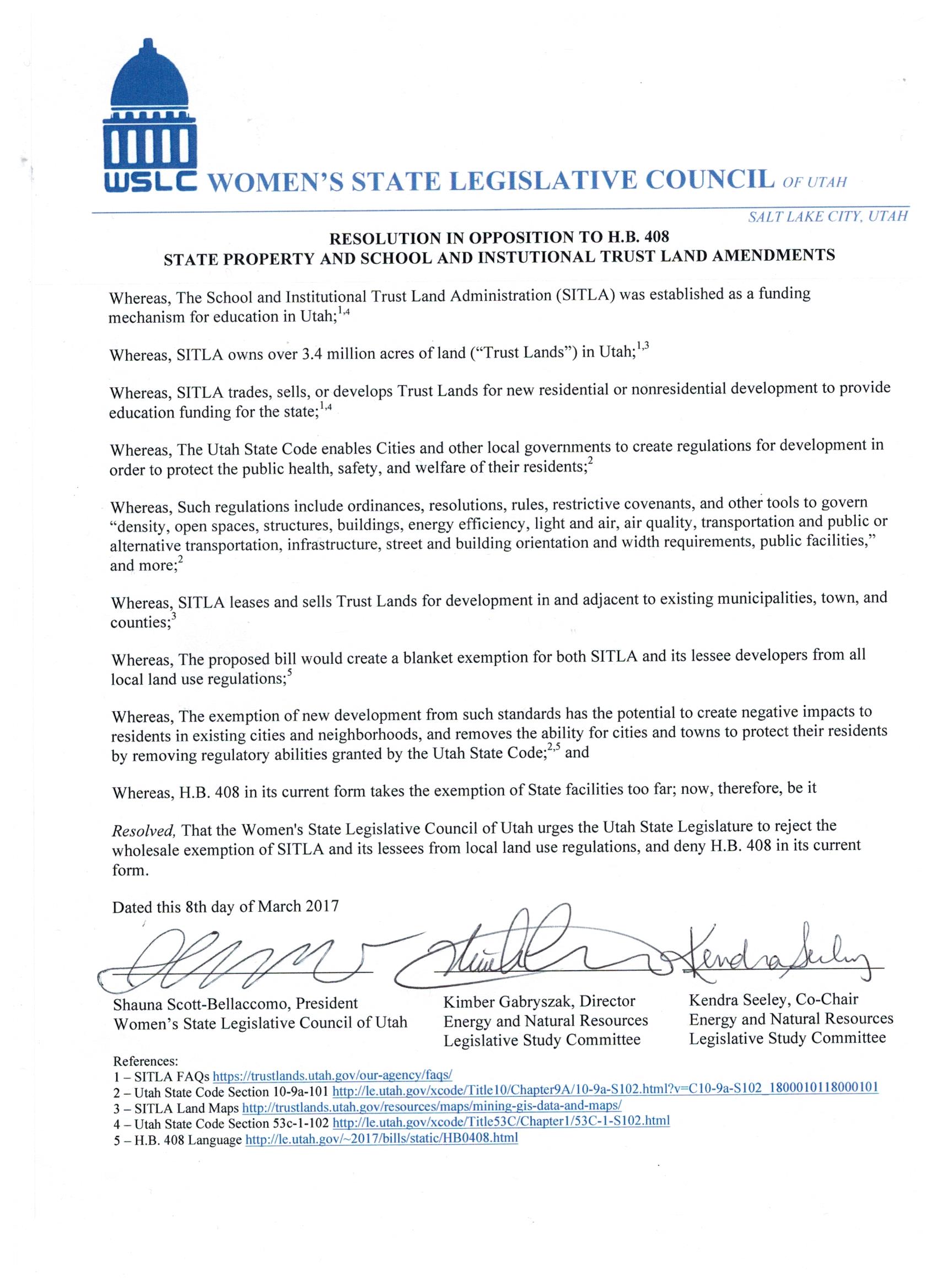 Good evening members, At our general meeting today, the attached Resolution in Opposition to HB408 State Property and School and Institutional Trust Land Amendments was presented and discussed. It was approved by a two-thirds majority of members present. We thank the Energy and Natural Resources Committee for preparing the resolution and all those who could attend today's meeting. Best, Gay Lynn Bennion WSLC Corresponding Secretary